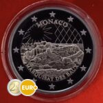 On the obverse is depicted in the center the famous rock of Les Baux-de-Provence (Bouches-du-Rhône) in its present state, together with the surroundings of the village of Les Baux-de-Provence. At the top of the coin appears the issuing country “MONACO”, accompanied on the right by a checkered shield and on the left by the star symbolizing Les Baux. At the bottom are the inscription “MARQUISAT DES BAUX”, the year of issue “2025”, as well as the mintmarks of the Monnaie de Paris and the general engraver Joaquin Jimenez. On the outer ring of the coin are the twelve stars of the European flag.