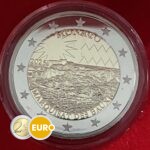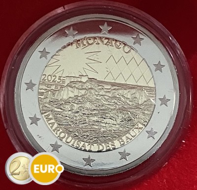 À l’avers figure au centre le célèbre rocher des Baux-de-Provence (Bouches-du-Rhône) dans son état actuel ainsi que les environs du village des Baux-de-Provence. En haut de la pièce figure l’État émetteur « MONACO », accompagné à droite d’un écu échiqueté et à gauche de l’étoile des Baux. En bas apparaissent la légende d’émission « MARQUISAT DES BAUX », l’année d’émission « 2025 » ainsi que les marques monétaires de la Monnaie de Paris et du graveur général Joaquin Jimenez. Sur l’anneau extérieur de la pièce figurent les douze étoiles du drapeau européen.