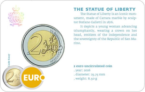 Saint-Marin émet en 2026 sa pièce de 2 euros standard dans une élégante coincard. La coincard est illustrée par une magnifique représentation de la Statue de la Liberté, symbole universel de liberté et d’indépendance.