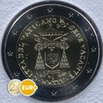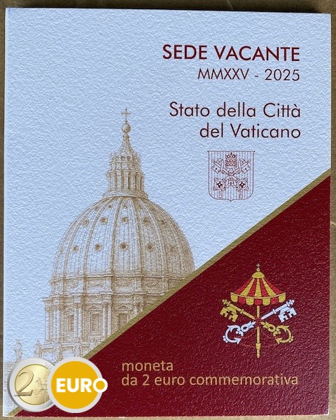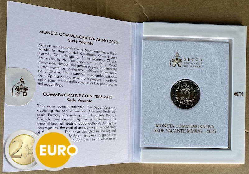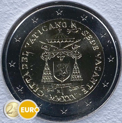 Wapen van de kardinaal-kamerheer, kardinaal Kevin Farrell, onder het symbool van de Apostolische Kamer, weergegeven door twee gekruiste sleutels onder een basiliekparasol. Aan de linkerzijde van de munt staat de uitgevende staat „CITTÀ DEL VATICANO”, aan de rechterzijde de gelegenheid van uitgifte „SEDE VACANTE” en aan de onderzijde het jaartal in Romeinse cijfers „MMXXV”. Rechtsboven in het motief onderbreekt een duif met een olijftak het doorlopende opschrift. Het muntteken „R” van de munt van Rome bevindt zich onder het wapen van de kardinaal-kamerheer, geflankeerd door de naam van de graveur links en het monogram van de ontwerpster „O. ROSSI” rechts.